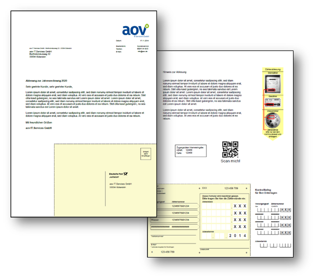 Vom Ableseauftrag, über die Erzeugung der Kundenanschreiben bis zur Bereitstellung der rückgemeldeten Zählerstände ins Abrechnungssystem.